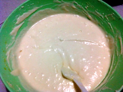 - Masukkan sedikit-sedikit A ke B sambil diaduk dengan spatula sampai tercampur seperti ini.